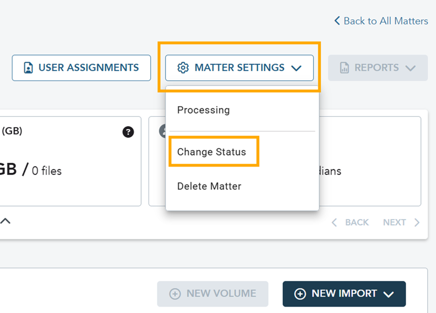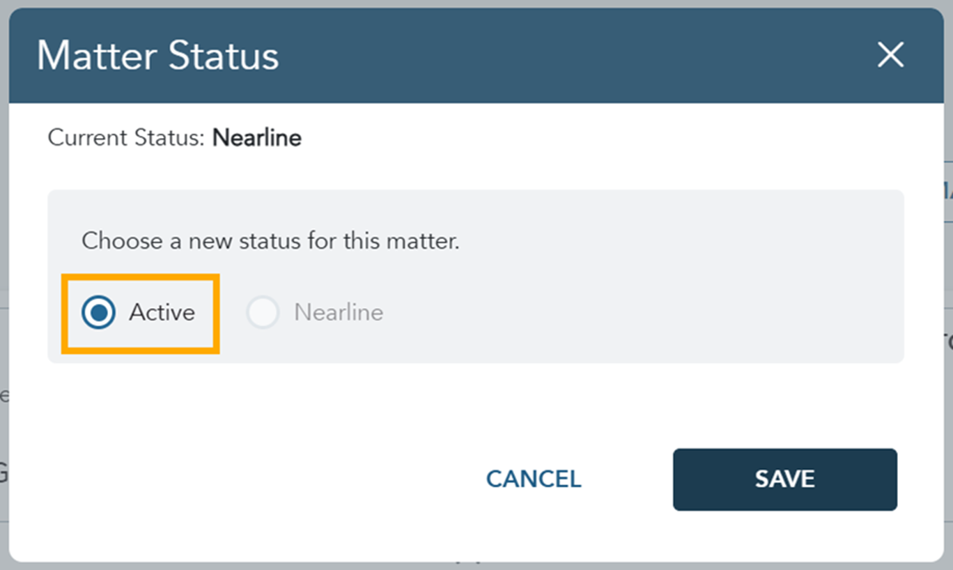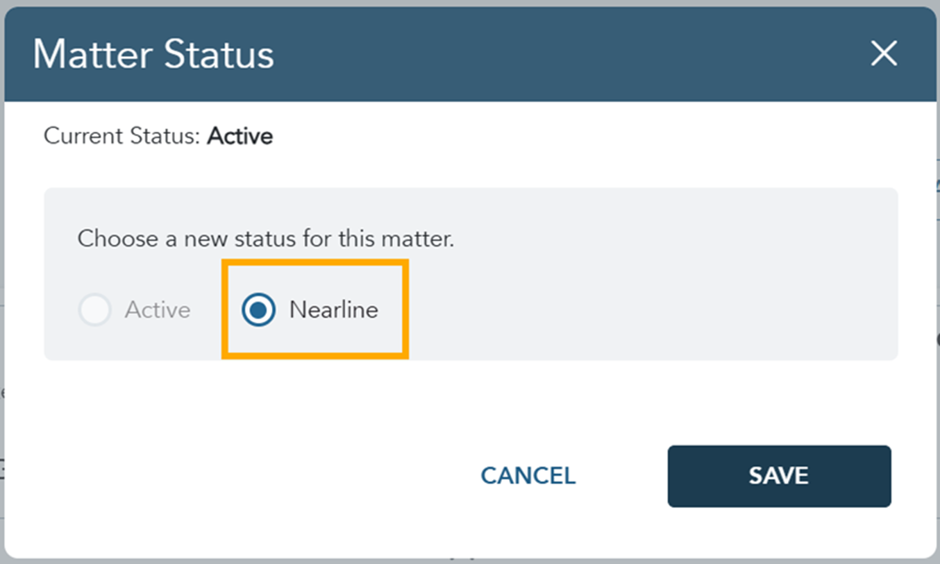 Client Admins have the option to move an active Matter to "Nearline" status, which temporarily restricts access to the matter while reducing monthly hosting costs. While in Nearline status, all aspects of the Matter are completely preserved but are otherwise unavailable to users.