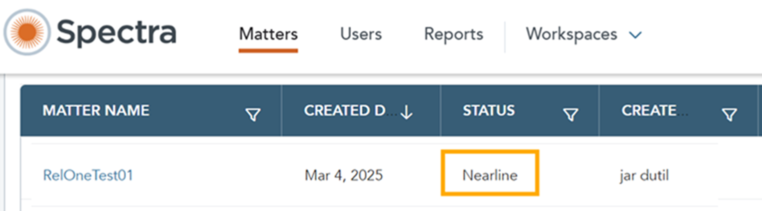 Matter Status on the Matter list will change to "Nearline - Pending" while the operation is in progress.